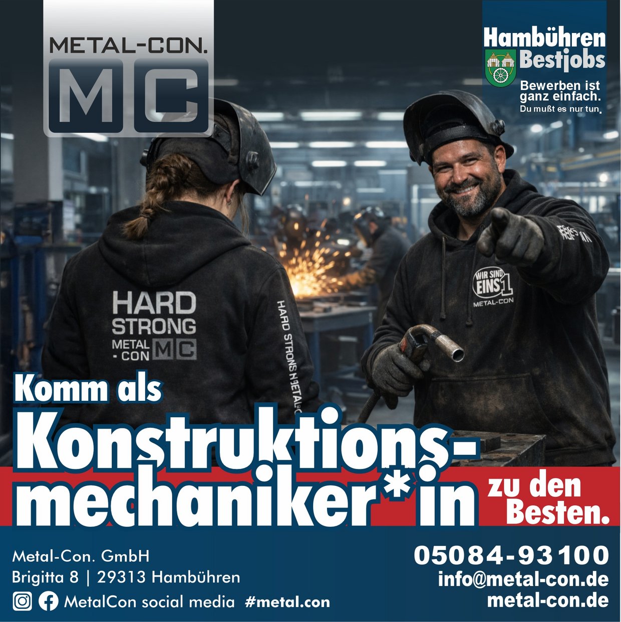 Als Konstruktionsmechaniker (m/w/d) bei Metal-Con in Hambühren bist du Teil eines erfahrenen Teams und arbeitest an hochwertigen Metallkonstruktionen für Industrie und Gewerbe.